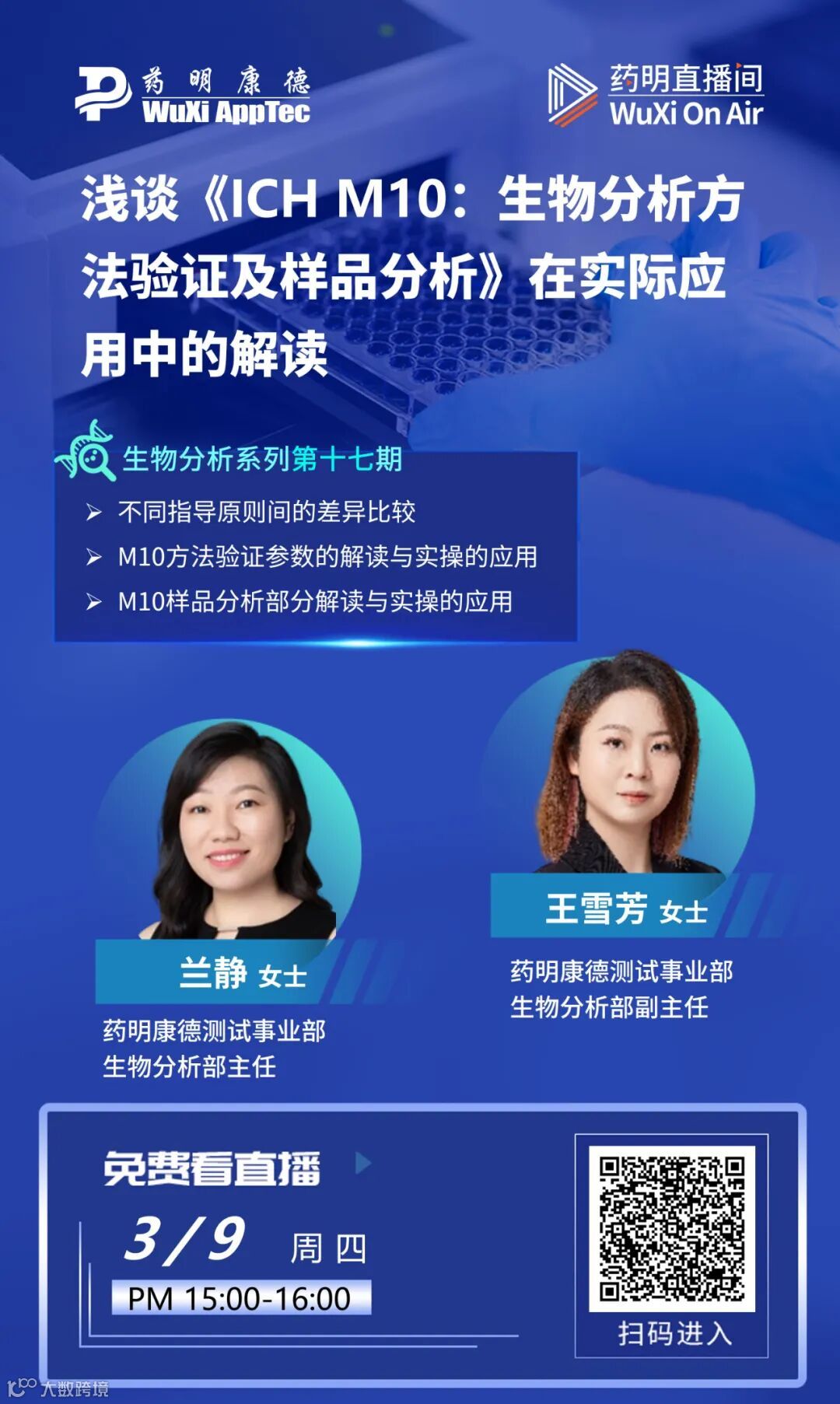 3月9日下午3点,药明康德测试事业部生物分析部主任兰静女士和副主任王雪芳女士将做客药明直播间,从各个法规层面和ICH M10正式版本的差异之处进行分析,对于色谱分析和配体结合部分,就方法验证和样品分析中的一些参数在实际应用场景进行解读。欢迎大家的参与!