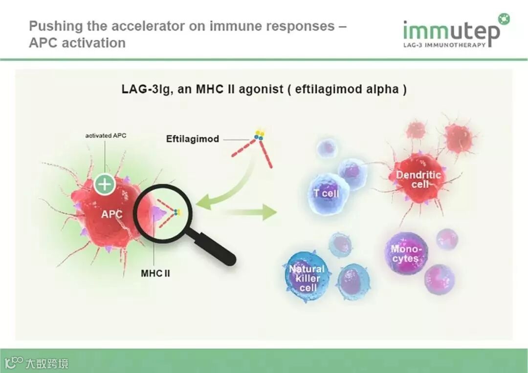 Efti是Immutep公司的潜在“first-in-class”抗原呈递细胞激动剂。它利用LAG-3可以与树突状细胞、单核细胞、巨噬细胞等抗原呈递细胞结合的特性,导致抗肿瘤细胞的扩增,以及将抗原呈递给适应性免疫系统,激发CD4阳性和CD8阳性T细胞的增殖。