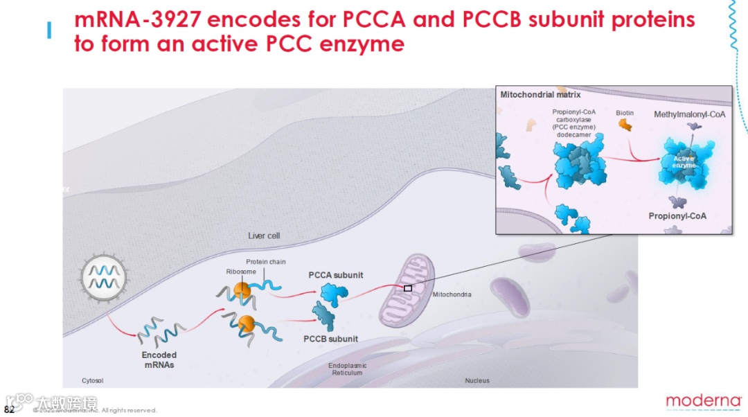 Moderna公司开发的mRNA-3927是一款编码丙酸血症患者中缺乏的丙酰辅酶A羧化酶(PCC)的mRNA疗法。它包括编码PCCA和PCCB两个亚基的mRNA,能够帮助细胞在体内合成具有活性的PCC蛋白酶。