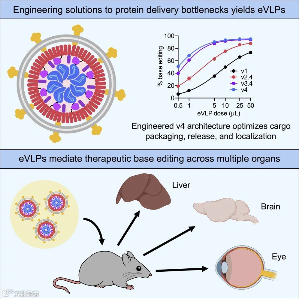 针对这些挑战,科学家们开发出了一种全新的工程化病毒样颗粒(简称eVLP),是首个能够向成年动物多种组织提供治疗水平的基因编辑蛋白的病毒样颗粒。在优化后,新型eVLP携带的蛋白质货物比过去增多了16倍,使编辑效果提高了8~26倍,在一些细胞实验中达到了95%的编辑效率!此外,这一技术还能在大脑、肝脏和视网膜等多个器官中实现了对多种目标基因的编辑。