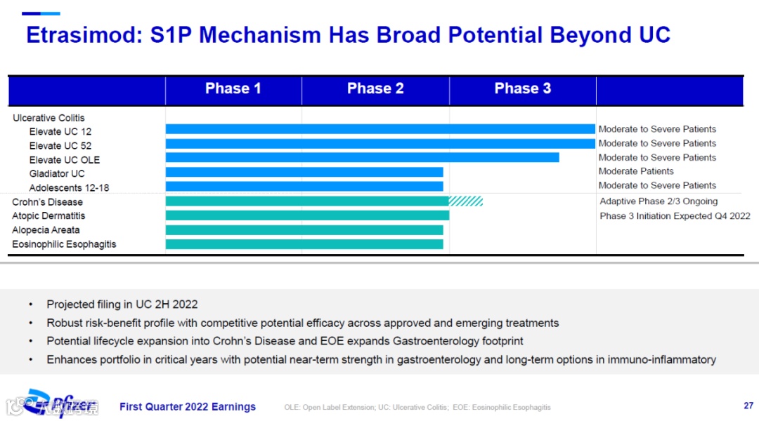 辉瑞表示,etrasimod的作用机制具有治疗溃疡性结肠炎以外炎症性疾病的潜力,检验etrasimod治疗克罗恩病、斑秃、特应性皮炎、以及嗜酸性食管炎效果的临床试验均已进入2期临床开发阶段。