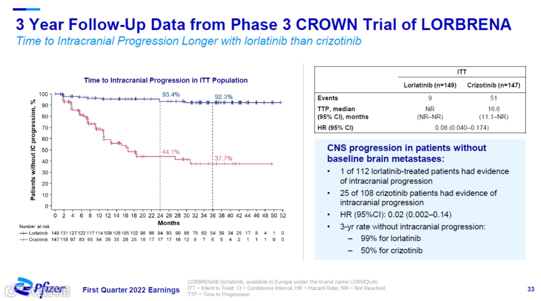 洛拉替尼由于能够穿越血脑屏障,因此在预防脑转移瘤的产生方面也显示出良好的效果。3年随访结果显示,在意向治疗患者中,与活性对照相比,洛拉替尼将出现脑转移瘤的风险降低92%。