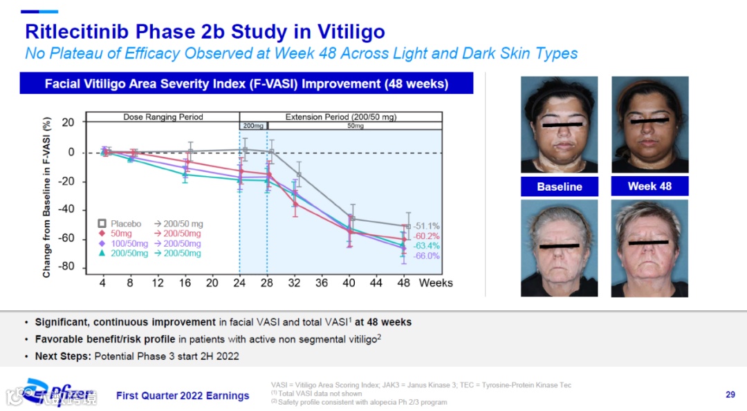 在治疗白癜风的2b期临床试验中,患者接受治疗48周之后,脸部白癜风面积严重指数(F-VASI)获得显著改善。辉瑞预计在今年下半年启动3期临床试验。