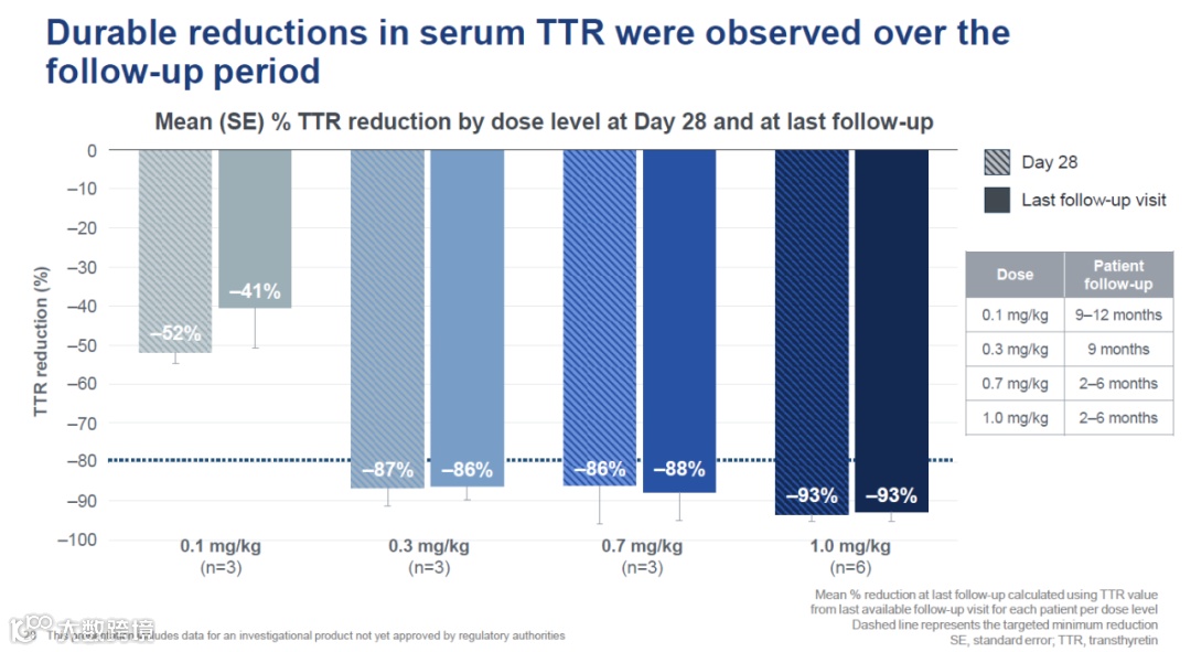 在治疗的28天后。每公斤体重给药0.1毫克、0.3毫克、0.7毫克的治疗组(每组3人)中,TTR蛋白的水平分别下降了52%、87%和86%。在接受每公斤体重1.0毫克的治疗组(6人)中,TTR蛋白的下降幅度达到了93%。新闻稿同时指出,在随访时间为2到12个月的间隔里,血清TTR蛋白的降低水平维持稳定。