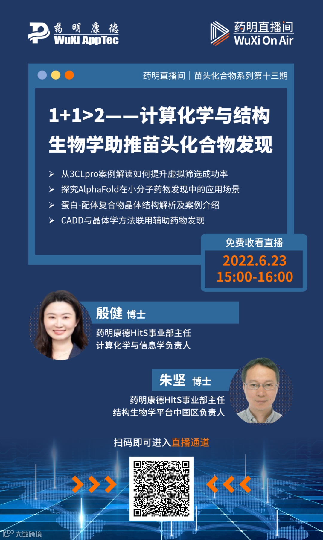 苗头化合物发现的效率与质量是决定整个药物研发项目进度的关键一环。当前的创新药研发大多是针对单个靶点与其相关疾病展开。在这种需求下,从靶点的三维结构出发,在分子水平上高效、快速地寻找与靶点结合的化合物结构的一系列方法,已经演变成为新药发现中的重要筛选手段。 得益于蛋白质晶体学、冷冻电镜和核磁共振等技术的应用,基于结构的药物设计(Structure-Based Drug Design, SBDD)方法迅速扩展,破译了各类以蛋白质为代表的生物大分子及复合物的结构和功能。与此同时,在强大的云计算、并行计算以及不断迭代的深度学习技术的多重加持下,基于机器学习模型预测蛋白质结构的AlphaFold横空出世,计算机辅助药物设计(Computer-Aided Drug Discovery, CADD)方法逐渐迎来“黄金时代”,有望在这条渴望成功的赛道上大放异彩。 针对这两种筛选方法,HitS有什么新思路呢?6月23日下午3点,药明康德HitS事业部主任、计算化学与信息学负责人殷健博士和药明康德HitS事业部主任、结构生物学平台中国区负责人朱坚博士将做客药明直播间,从案例出发,分享如何提升虚拟筛选成功率,如何借助HitS蛋白质晶体学平台加速药物研发,以及计算化学与蛋白晶体学平台联动辅助药物发现。期待您的参与! 注册报名本次研讨会免费对外开放,请长按下方二维码报名,快速进入直播通道。