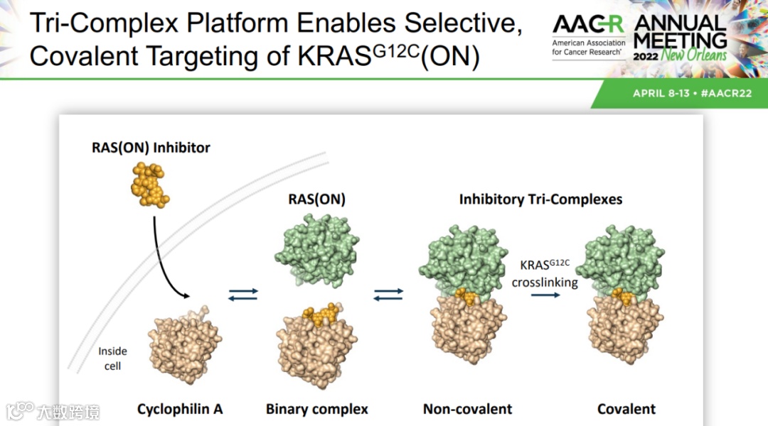 与众不同的是Revolution Medicines公司开发的RMC-6291。这款大环分子的作用方式像一款分子胶,将KRAS G12C和cyclophilin A粘合在一起,形成的三元复合体阻断处于激活状态的KRAS G12C与RAS效应蛋白结合,从而抑制下游信号传导。在今年AACR发表的临床前研究显示,这款KRAS G12C抑制剂在小鼠NSCLC模型中表现出比靶向失活状态KRAS G12C突变体的抑制剂更强的抗癌活性。