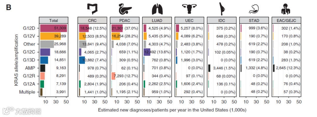 ▲美国新确诊癌症患者中不同KRAS突变的比例(图片来源:参考资料[1])