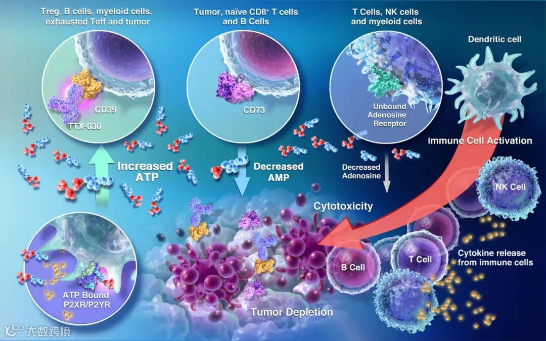 今年AACR年会上,研究人员将汇报潜在“first-in-class”抗CD39抗体TTX-030,与化疗和免疫疗法联用,一线治疗局部晚期或转移性胃癌的临床试验结果。TTX-030由Trishula Therapeutics和艾伯维(AbbVie)合作开发。它靶向抑制CD39的活性,CD39是将ATP转化为AMP的代谢酶,ATP转化为AMP是在肿瘤微环境中生成腺苷的起始步骤。TTX-330通过阻碍免疫抑制性腺苷的形成,维持具有免疫激活性质的高水平细胞外ATP,可以刺激先天和适应性免疫反应。艾伯维拥有在完成1b期临床研究后,获得TTX-030全球研发权益的选择权。