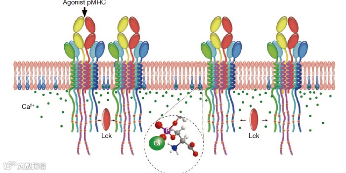 而在接收到胞外信号激活后,TCR会活化并使得Ca2+通道打开,大量Ca2+内流进入T细胞后,在TCR复合物附近形成高浓度的微区,竞争性地中和了膜脂质的负电性,从而将CD3ε/ζ的胞内信号域从膜脂质中解离,释放到胞浆区域,暴露的CD3酪氨酸基团被Lck磷酸化并开始招募下游分子,从而启动后续免疫应答。