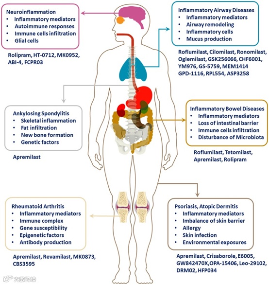 ▲炎症性疾病的病理表现和相应的PDE4抑制剂(图片来源:参考资料[3])