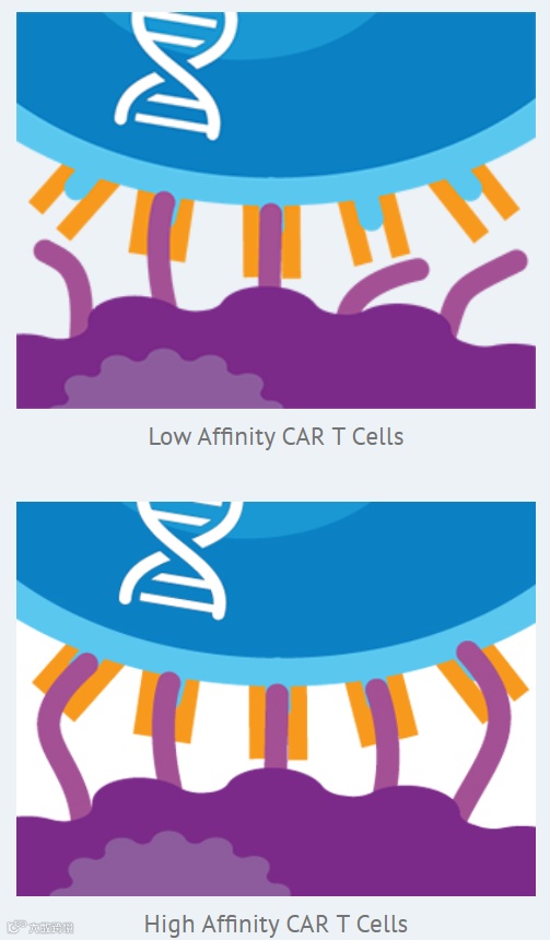 AffyImmune的策略是降低CAR的亲和力。虽然迄今为止大多数CAR-T细胞都使用对靶标具有高亲和力的CAR,但越来越多的证据表明,高亲和力的CAR会结合正常组织上较低水平表达的靶标,导致不必要的毒性,并可能长时间激活T细胞,导致T细胞耗竭。
