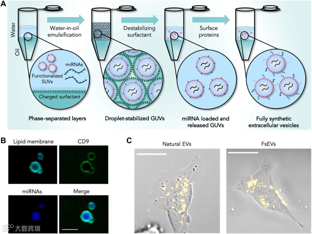 在这项研究中,研究人员从脂质微滴起步,加入在天然外泌体中存在的微RNA(miRNA),以及在外泌体表面存在的蛋白,构建了模拟天然外泌体的人工合成细胞外囊泡。与分离的天然外泌体相比,这一从头合成的技术让研究人员能够对外泌体的功能进行微调,从而创立一种可“编程”的外泌体合成技术。