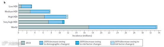 ▲预计2070年全球所有癌症类型新发病例变化,按HDI划分。蓝色部分为对比2018年的增幅,箭头代表风险因素变化带来的癌症负担增加/减少(图片来源:参考资料[1])