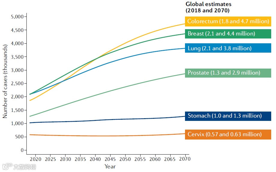 ▲2018年-2070年全球主要癌种新发病例数变化趋势,从上至下依次为结直肠癌、乳腺癌、肺癌、前列腺癌、胃癌和宫颈癌。(图片来源:参考资料[1])