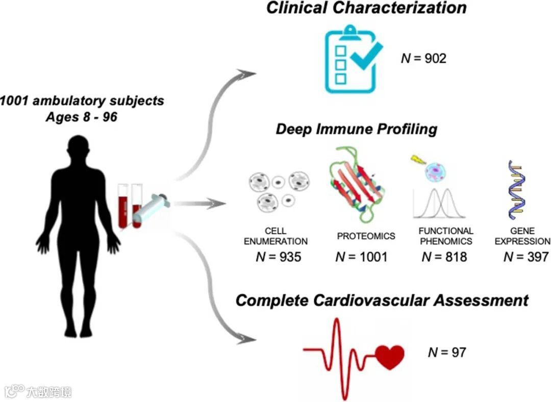 为了开发评估炎症状态的指标,Furman教授领导的“1000免疫组学项目”在2009年~2016年期间,采集了1001名健康志愿者的血液样本,这些志愿者的年龄范围很广,从8岁到96岁。样本经过一系列分析,包括各种细胞因子的水平,各类免疫细胞的活化状态,每种细胞中数千个基因的活化程度等。