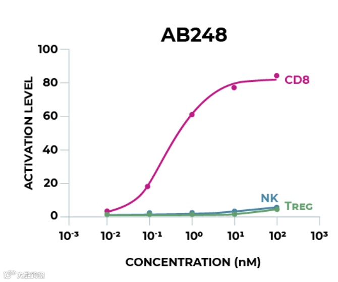 在临床前实验中,AB248在大幅度激活CD8阳性T细胞的同时,几乎不激活自然杀伤细胞和Treg细胞。在多种临床前肿瘤模型中已经表现出良好的抗癌活性。