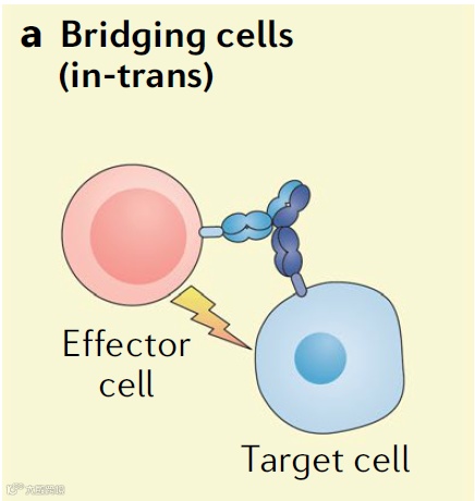 在双特异性抗体的开发领域,最先出现的也是目前最常见的抗体类型是将两种不同细胞连接在一起的双特异性抗体,这些抗体的一端与一种细胞表面的特异性抗原结合,另一端与另外一种细胞表面的特异性抗原结合,从而将两种不同的细胞拉近到一起,促使它们之间产生相互作用。这种双特异性抗体的代表之一就是T细胞接合器(T cell engager)。