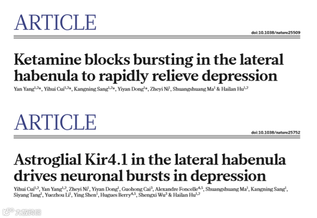 胡海岚及其团队也在一系列研究中以理解氯胺酮的快速抗抑郁机制为切入点,从分子细胞、神经环路层面提出了抑郁症的新机制模型,为人类进一步认识与治疗这一棘手疾病带来了希望。2018年2月,他们破纪录地在同一期《自然》期刊中发表了两篇研究论文,阐述了相关的结果。