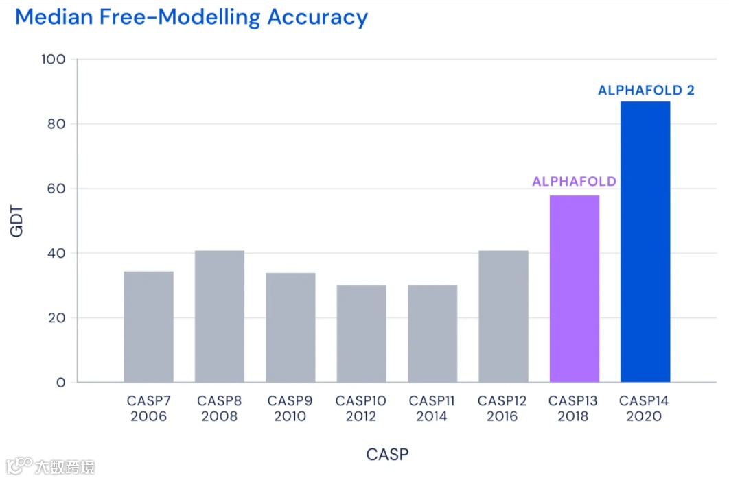 ▲2006-2020年CASP比赛中最佳蛋白折叠预测系统的评分表现(图片来源:DeepMind Blog)