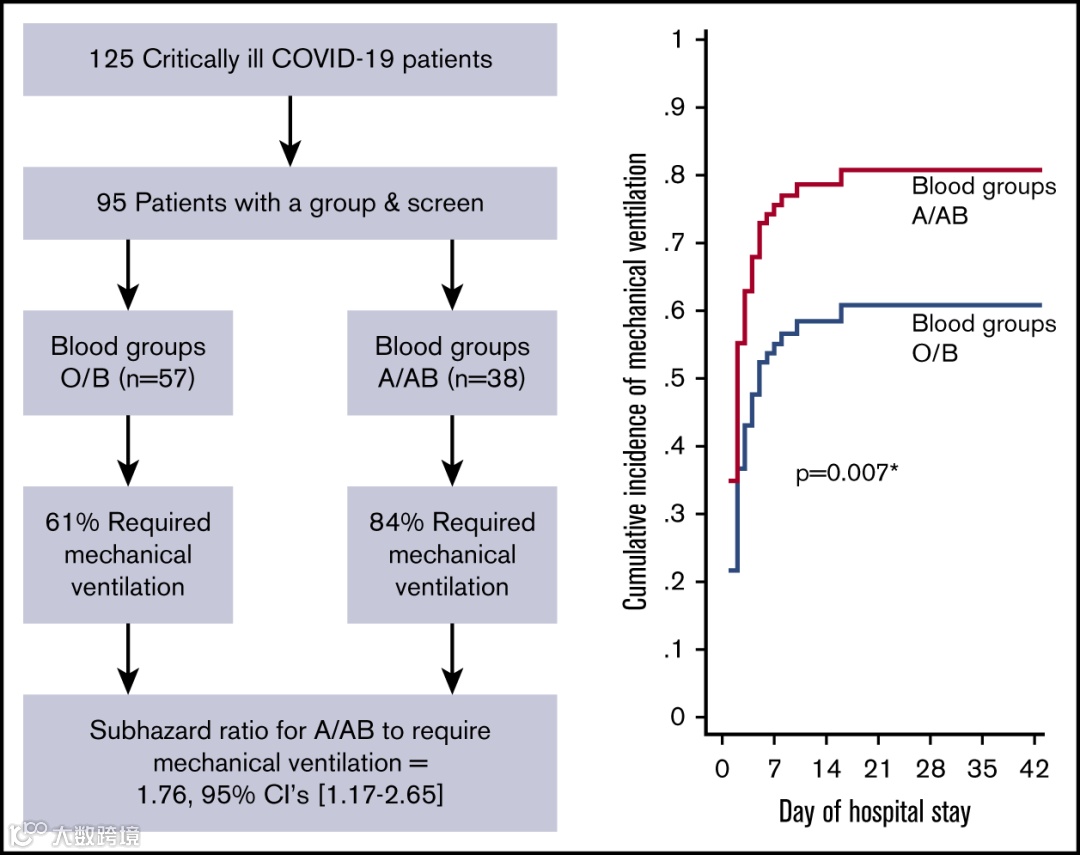 来自于加拿大不列颠哥伦比亚大学的研究者发现,在95名重症COVID-19患者中,有84%的血型为A型和AB型的患者需要机械通气,而对于O型或B型血患者,该比例为61%。前者在重症监护病房中的中位停留时间为13.5天,而后者的中位停留时间为9天。研究者还发现,更多的A型和AB型患者需要透析治疗肾功能衰竭。