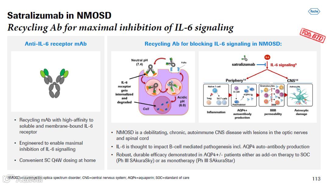 虽然NMOSD被认为是由于靶向AQP4的自身免疫抗体进入CNS导致的疾病,但是大约三分之一的患者体内没有靶向AQP4的自身免疫抗体。近年来,促炎症细胞因子IL-6是NMOSD病理发生中的一个新兴重要靶点,它触发炎症级联反应,导致损伤和残疾。罗氏开发的Enspryng是一种完全人源化的IL-6受体单克隆抗体。它可以抑制IL-6信号通路,并且抑制炎症的产生和靶向AQP4的自身免疫抗体生成。Enspryng每四周皮下注射一次,对患者和护理人员来说是一个方便的治疗选择。美国FDA曾授予该疗法突破性疗法认定。