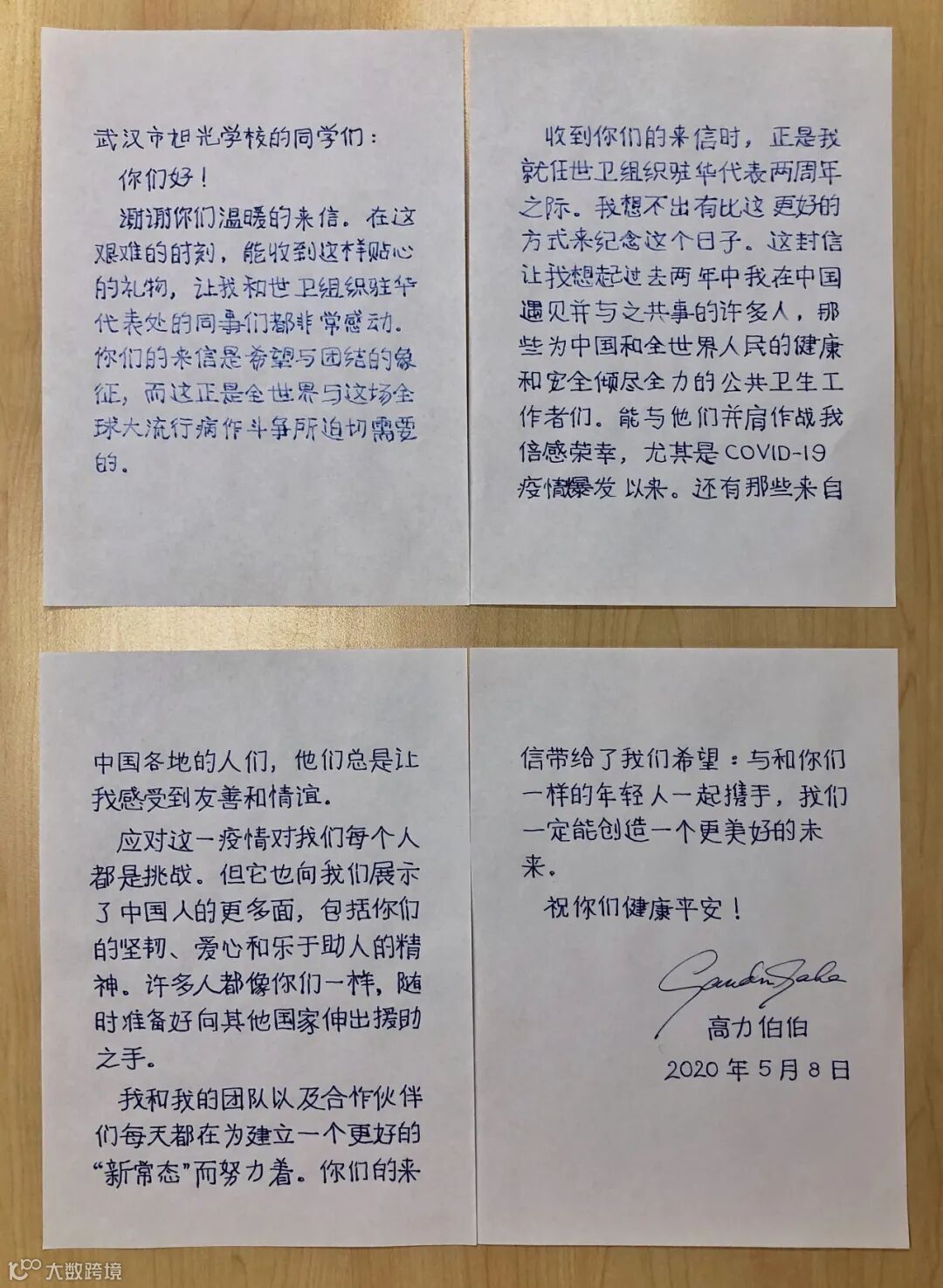 透过笔迹,我们深切感受到武汉的同学们对生活的热爱,对全球疫情和全人类的关心。这封信中的每一个文字,都让世界卫生组织驻华代表高力医生以及所有世卫组织驻华代表处的同事们感动不已。