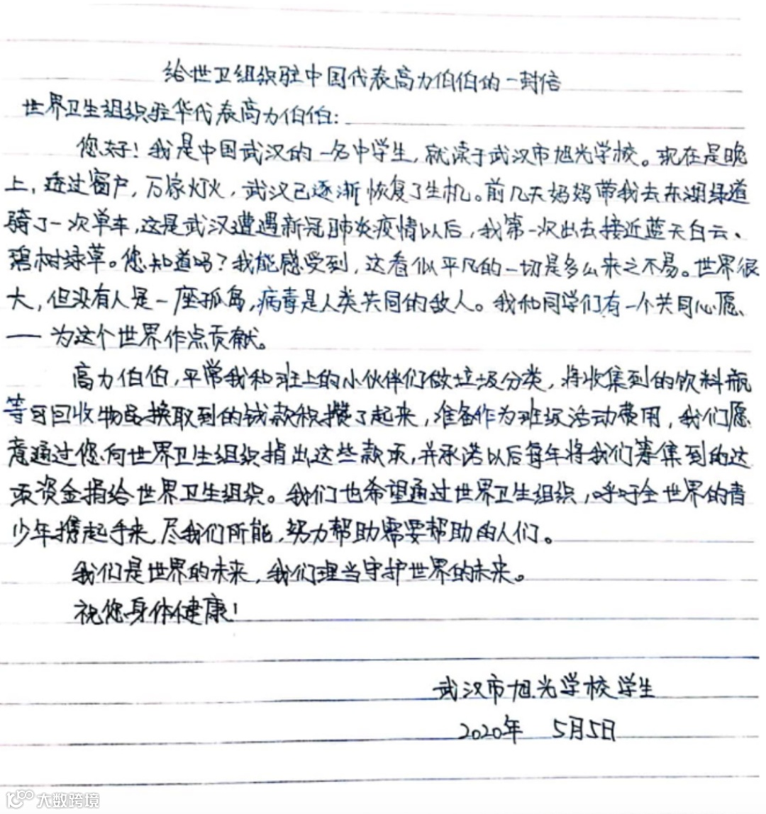 中学生写给世卫组织驻华代表高力的一封信》的报道中,看到了这封来自武汉市旭光学校学生的手写信。