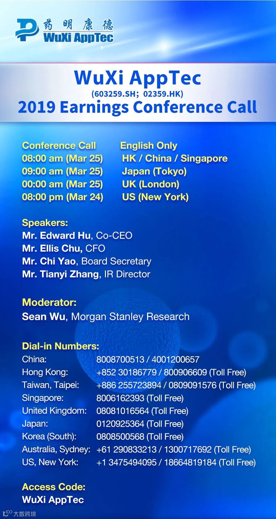 WuXi AppTec is pleased to invite you to our 2019 Earnings Conference Call on March 25, 2020, China time (March 24, 2020, EST). Conference call details are listed below.