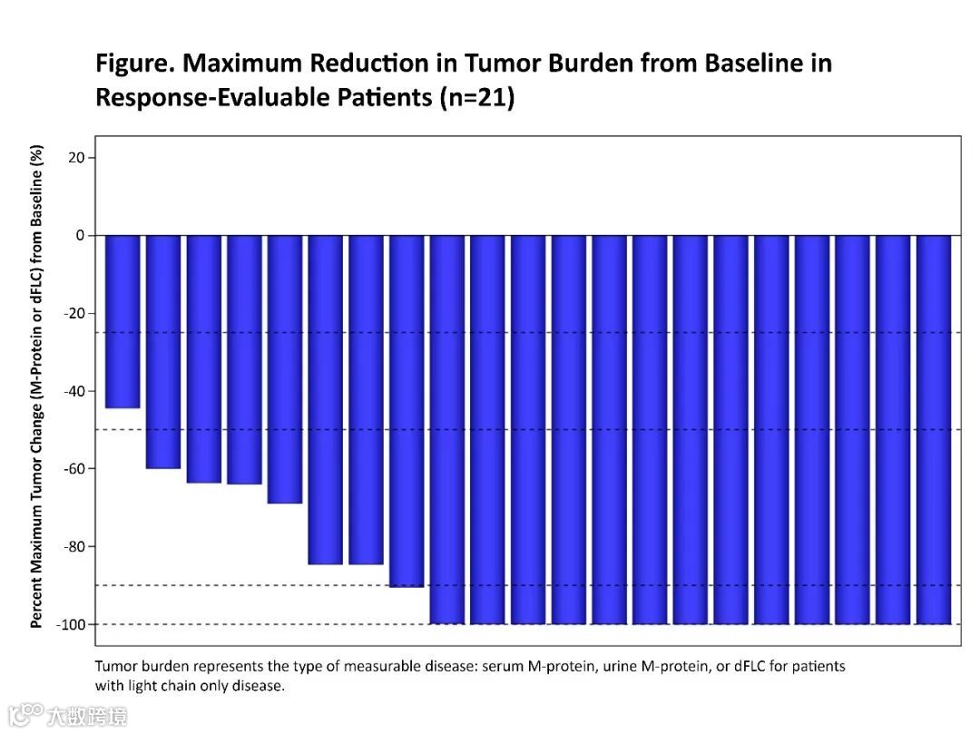 试验数据表明JNJ-4528能够给患者带来迅速而且深度的缓解。在21名能够被评估的患者中,所有患者的肿瘤负担都有所减小,患者的ORR为91%,其中包括4例严格完全缓解(stringent complete response),2例完全缓解,7例非常好的部分缓解和6例部分缓解。在15名骨髓样本接受检测的患者中,10名患者的微小残留病灶在10的负5次方水平上为阴性。