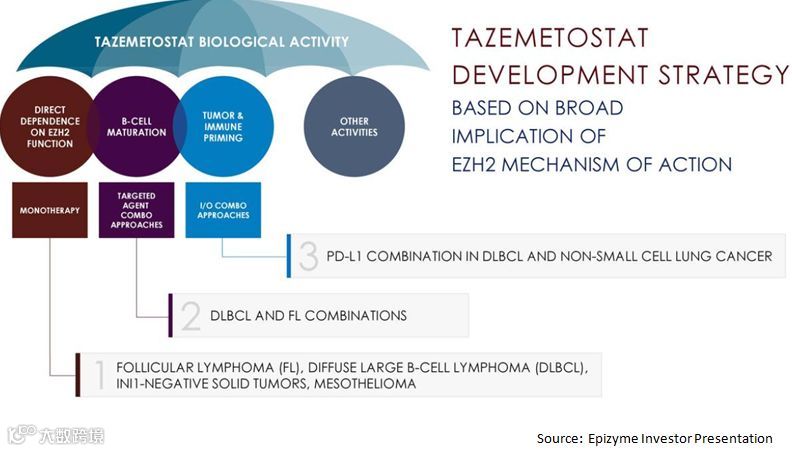 Epizyme对tazemetostat的研发策略包括3个方向:一是作为单药疗法,用于直接依赖于EZH2活性的疾病,包括INI1阴性实体瘤,间皮瘤,非霍奇金淋巴瘤(NHL)等;二是作为组合疗法,与化疗药物R-CHOP组合,治疗弥漫性大B细胞淋巴瘤(DLBCL)等;三是与免疫检查点抑制剂Tecentriq联用,治疗非小细胞肺癌(NSCLC)等。