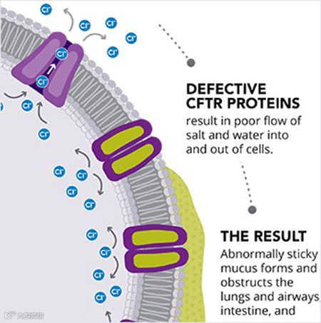 CF是由于编码囊性纤维化跨膜电导调节因子(Cystic Fibrosis Transmembrane conductance Regulator,CFTR)的基因发生突变,导致CFTR蛋白缺失或功能缺陷引起的遗传病。CFTR基因中有约2000个已知的突变。CFTR蛋白的功能缺陷或缺失导致许多器官细胞中盐和水的流入和流出不均衡,在肺部会造成异常粘稠的粘液积聚,引起慢性肺部感染和进行性肺损伤,并最终导致死亡。CF是一种罕见的,缩短寿命的遗传性疾病,在北美,欧洲和澳大利亚的约7.5万人受到影响。