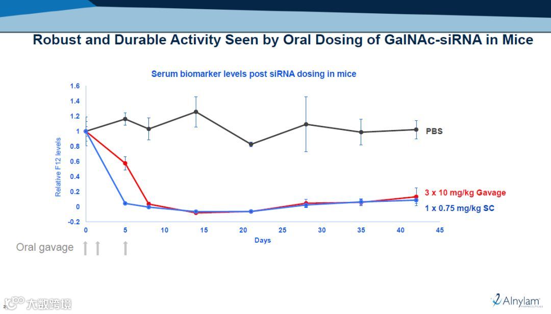 日前,专注于开发RNAi疗法的生物医药公司Alnylam在学术会议上公布了该公司RNAi技术平台的最新突破。临床前实验结果表明,Alnylam的创新siRNA口服配方能够达到与皮下注射配方相同的效果。中枢神经系统(CNS)和眼部递送siRNA也能够长久有效地沉默基因表达。(在药明康德微信号回复“RNAi”,即可获得Alnylam学术报告PPT下载地址。)