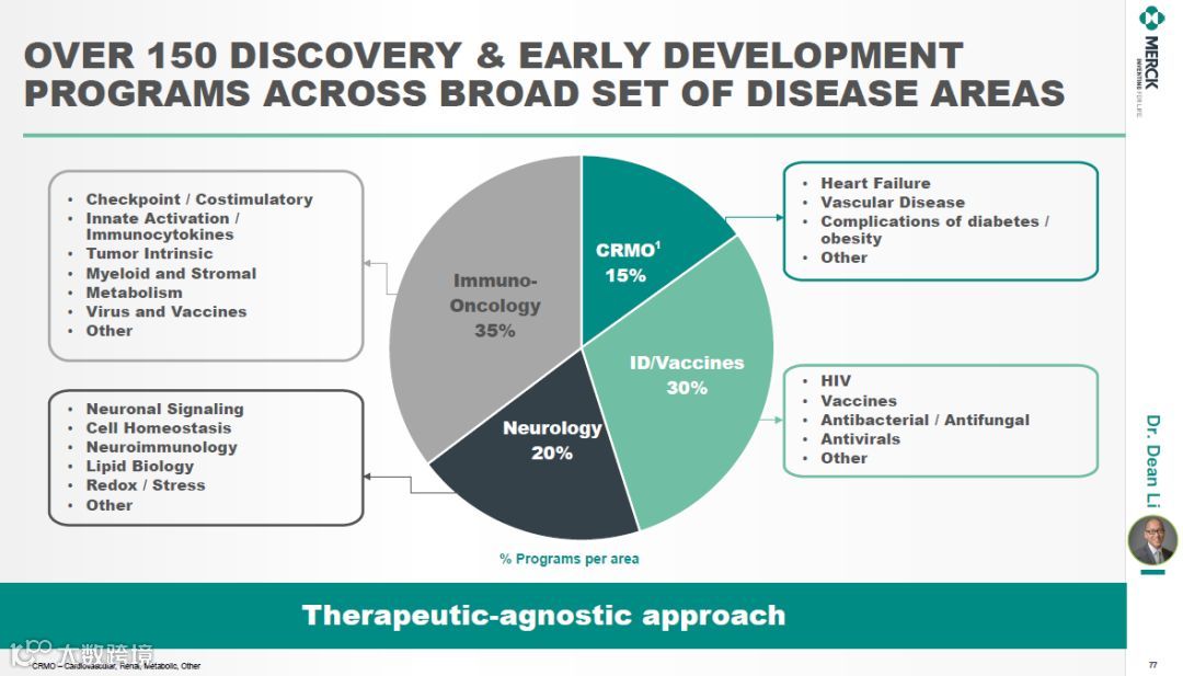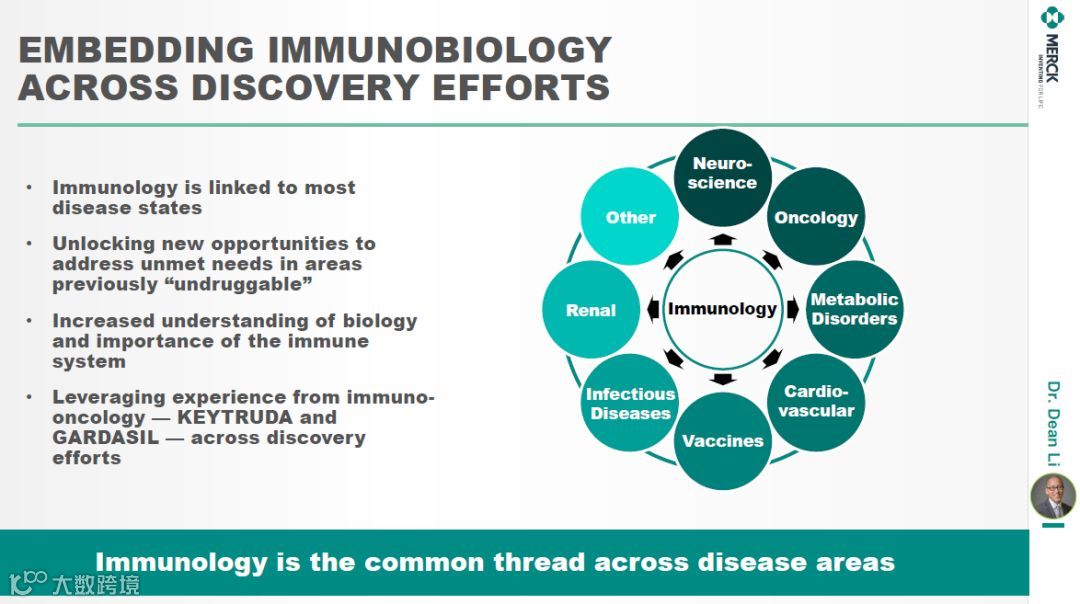 默沙东研究实验室发现科学和转化医学高级副总裁Dean Li分享了默沙东的早期研发策略。他表示,免疫学与大多数疾病相关。默沙东的早期研发工作将利用自身在开发Keytruda和Gardasil时在免疫学方面积累的经验和专长,进一步理解免疫系统的重要性,开拓在以前“不可成药“领域的新机会。