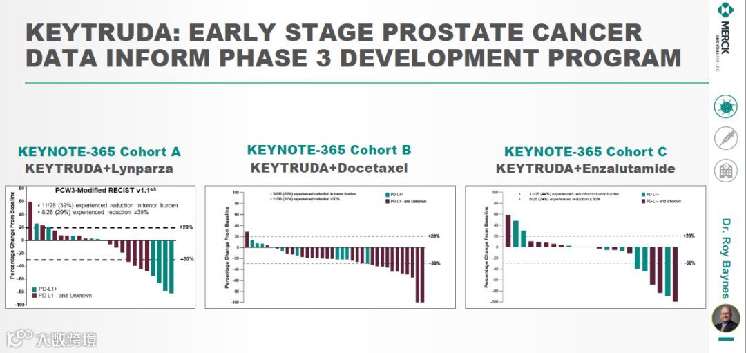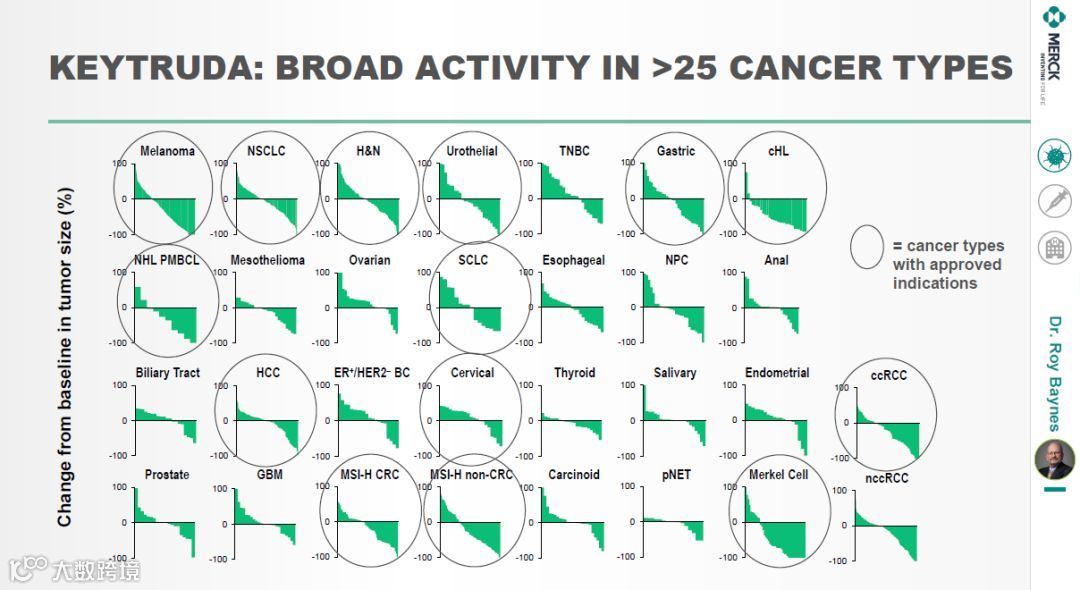 默沙东研究实验室首席医学官Roy Baynes博士用两张内容满满的幻灯片展现了Keytruda做为单药或组合疗法的基石,不但能够在多种癌症中将肿瘤缩小,而且延长了患者的总生存期。
