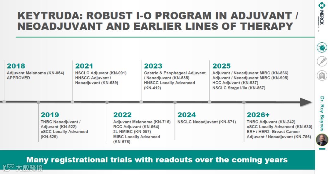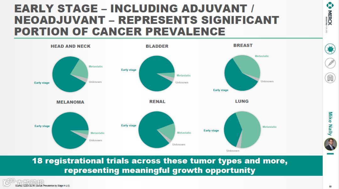 在投资者大会上,Roy Baynes博士给出了多项新辅助/辅助疗法和早期疗法研究项目的时间表,多项可能进一步扩展Keytruda应用范围的注册性临床试验将在未来几年中获得试验结果。