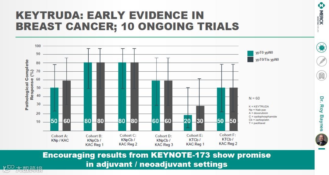 Keytruda目前正在进行的临床试验中,有超过100项是作为新辅助/辅助疗法治疗早期癌症患者。其中,在治疗局部晚期三阴性乳腺癌(TNBC)患者的KEYNOTE-173早期临床试验中,Keytruda与化疗结合,作为新辅助疗法显示出可喜的疗效。