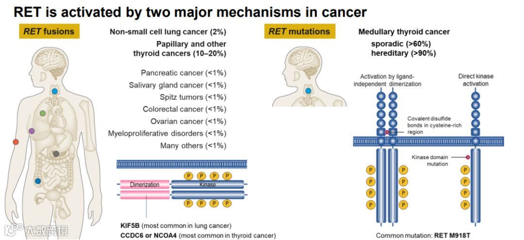 在编码RET蛋白激酶的基因上出现的变异包括融合和激活性点突变,这会导致RET信号通路过度激活和无法控制的细胞增长。RET融合在大约2%的NSCLC中出现,而激活性RET点突变在大约60%的甲状腺髓样癌(MTC)中出现。携带RET融合或RET点突变的肿瘤主要依靠这一激活的蛋白激酶来支持他们的增殖和生存,因此他们对靶向RET的小分子抑制剂非常敏感。