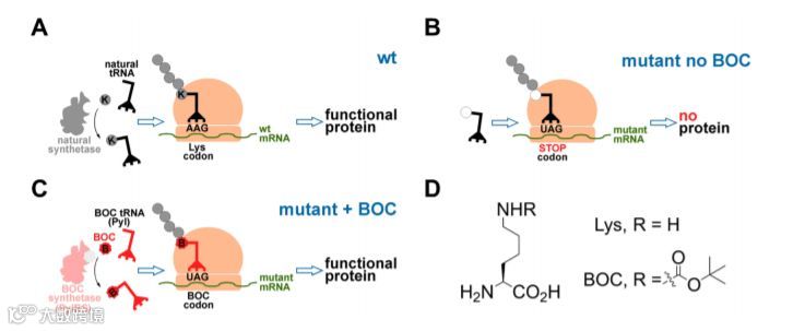 在这项研究中,研究人员将原本编码中止信号的“UAG”密码子与一种名为BOC的非天然氨基酸配对,他们同时在编码Cas9蛋白的基因序列中引入UAG密码子。这导致这种新型Cas9蛋白的合成时需要环境中存在BOC氨基酸,如果BOC氨基酸不存在,那么Cas9蛋白就无法合成,CRISPR/Cas9基因编辑系统就没有活性。而在环境中加入BOC氨基酸则会导致Cas9蛋白的合成,激发基因编辑系统的活性。
