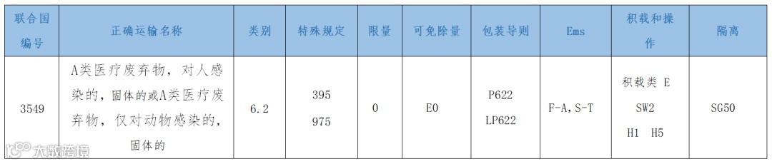 新增“A类医疗废弃物,对人感染的,固体的或A类医疗废弃物,仅对动物感染的,固体的”(UN 3549)1个第6.2类感染性物质条目及其安全运输条件。A类系指以某种形式运输的感染性物质,当接触该物质时,可造成健康的人或动物的永久性致残、生命危险或致命疾病。