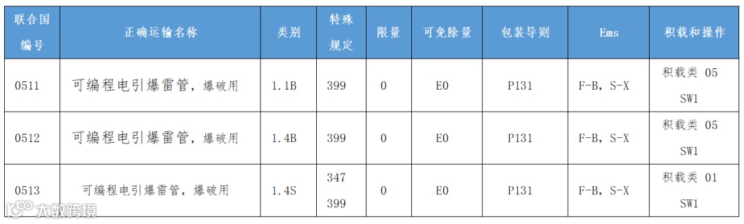 新增SP 399:对于符合附录B中电引爆雷管定义且被划分到UN 0511,UN 0512和UN 0513的物品,在2025年6月30日前可继续使用电引爆雷管条目(UN 0030,UN 0255和UN 0456)。
