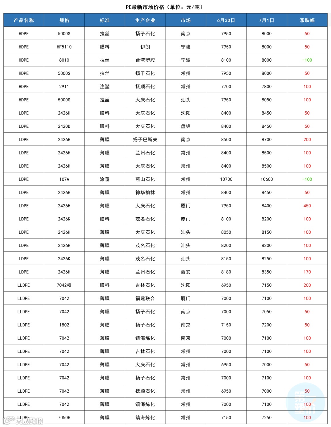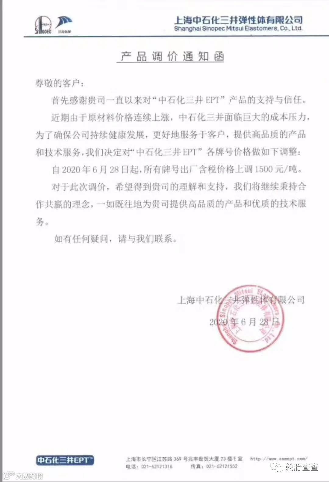 中石化三井弹性体育有限公司发出产品调价通知函:自2020年6月28日起,公司决定对“中石化三井EPT”所有牌号出厂含税价上调1500元/吨。