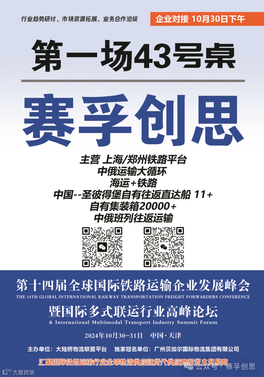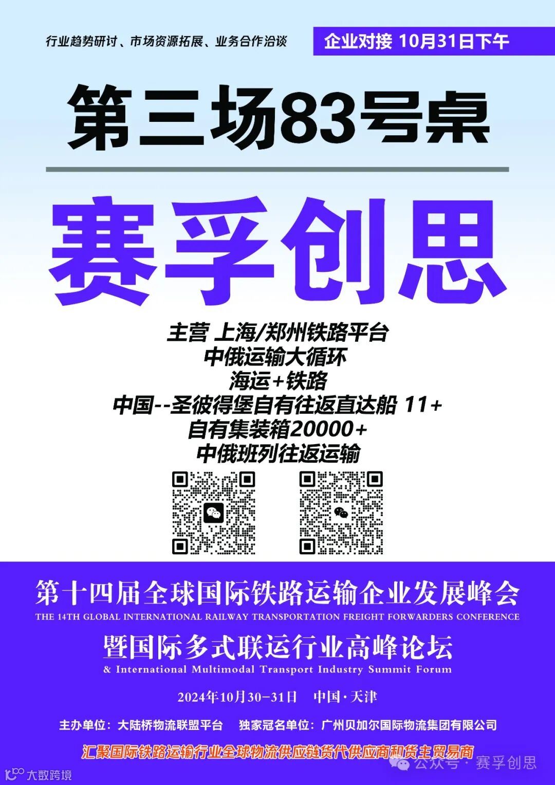 第十四届全球国际铁路运输企业发展峰会将于10月30-31日在天津举办。届时,作为领先的国际多式联运物流服务商,赛孚创思将携同专家团队,与来自中亚五国、俄罗斯、欧洲各国、蒙古国、独联体、日韩及东南亚等地区的800多位行业精英积极对话,探讨行业趋势,拓展市场资源,分享成功案例。
