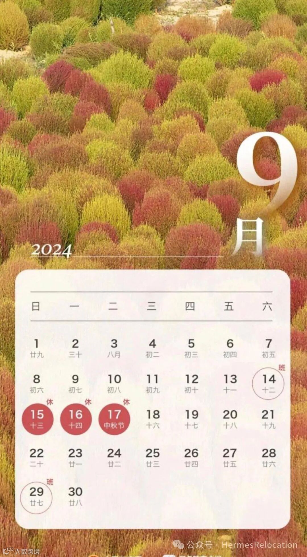 Mid-Autumn Festival(Zhong qiu jie) Sept.15-Sept.17,2024. Pay attention Sept.14 and Sept.19 are working days