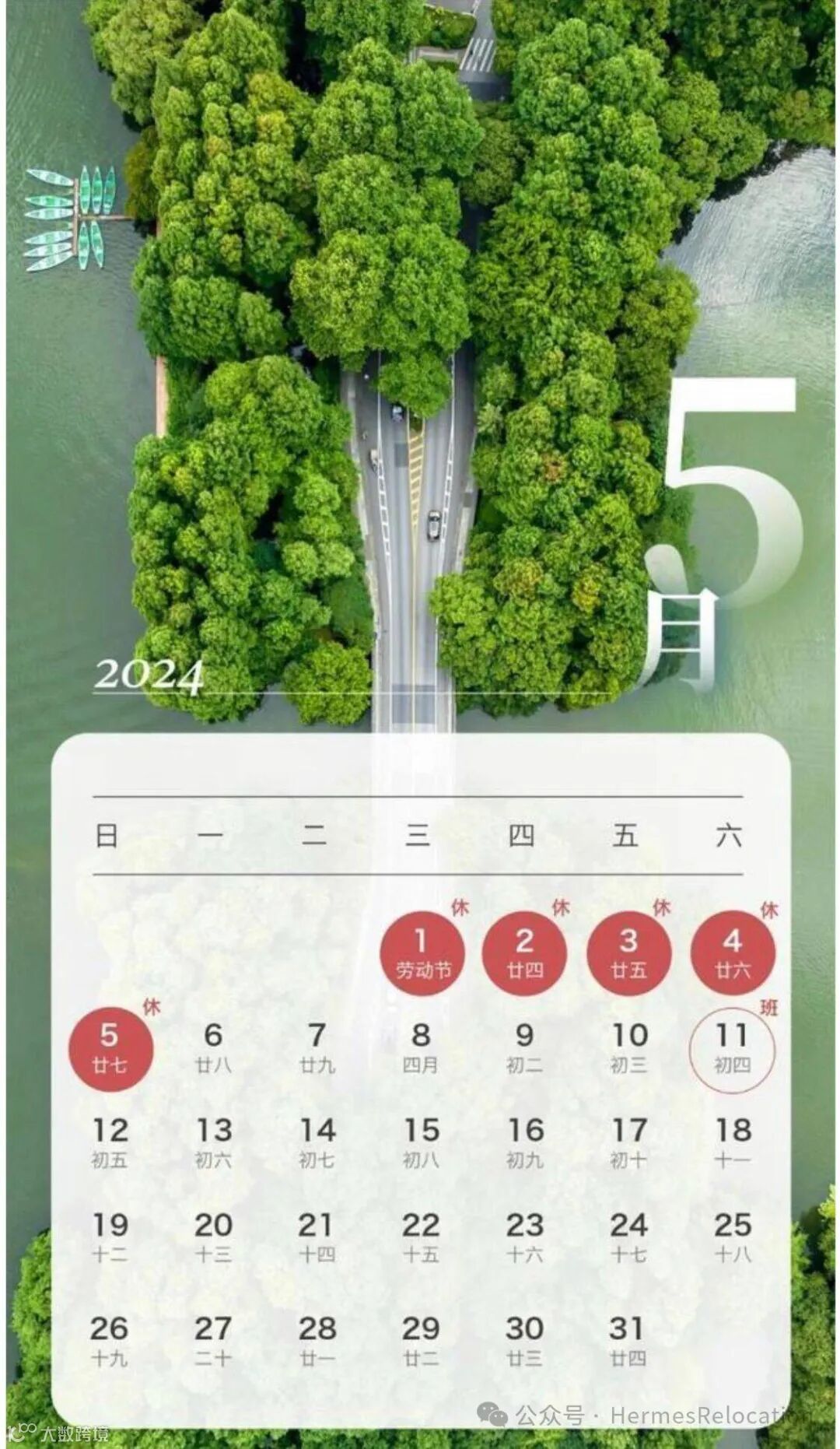 May Day Holiday(Labour's Day holiday,Lao dong jie), 5 days holiday, May1. -May 5,2024.Pay attention May 11 is a working day