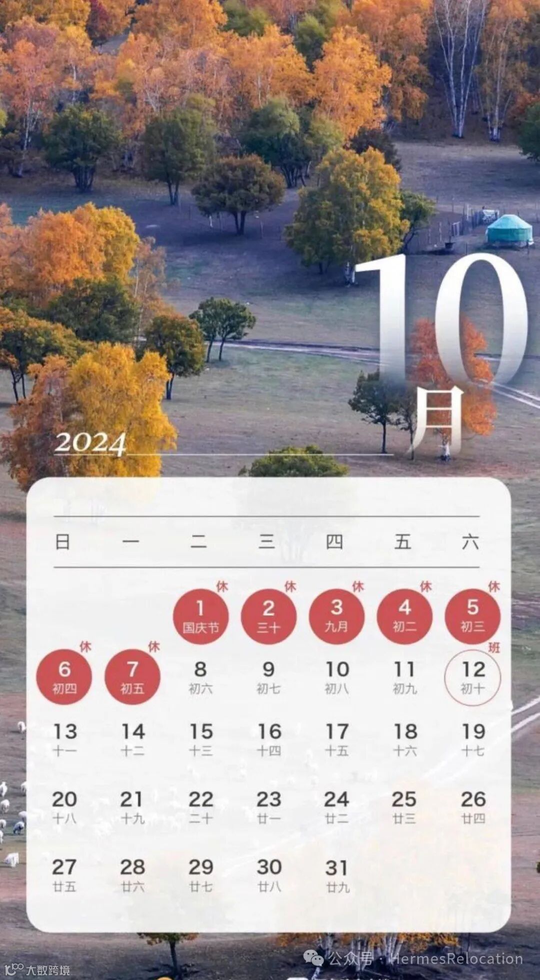 National Day Holiday(Guo qing jie), 7 days holiday, Oct. 1-Oct.7,2024.Pay attention Oct.12 is a working day