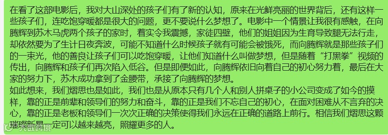 影片中传递的百折不挠、永不言弃的精神正是此次观影活动举办的学习初衷;一如我司初创之时,踌躇满志砥砺前行,就像是用拳打出未来的孩子们,唯有不断奋发方得始终。