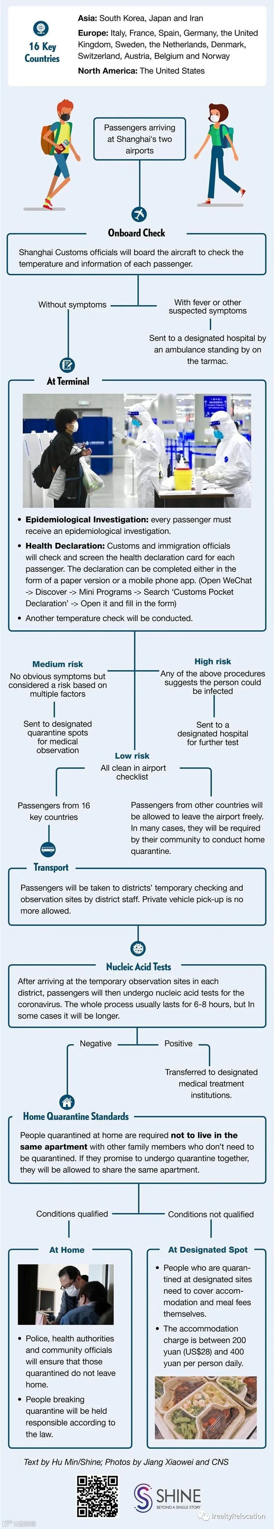 From March 20th 2020, Shanghai has expanded its list of key countries seriously affected by the coronavirus to 24 countries: South Korea, Philippines, Australia, Malaysia, Greece, the Czech Republic, Finland,Qatar, Canada, Saudi Arabia ,Italy, Iran, France, Spain, Germany, the United States, the United Kingdom, Switzerland, Sweden, Belgium, Norway, the Netherlands, Denmark and Austria. People who have lived or traveled in these countries within two weeks prior to their arrival in Shanghai must undergo 14-day quarantine at home or at designated places upon arrival in the city.