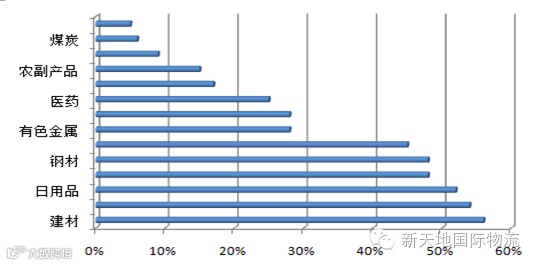 随着我国经济发展方式的转变,钢铁、煤炭、化工等生产资料领域的增速进一步放缓,而第三产业产值增速逐步增加,加之电子商务快速发展,物流需求出现了“黑冷白热”“网涨店缩”的现象。问卷调查数据显示,物流园区流转商品中建材、日用品、食品等生活资料占主要地位。只有不足50%的物流园区流转商品中含有钢材、纺织品,而流转商品中含有色金属和化工品的物流园区仅占到28%,含有煤炭的物流园区仅占到6%,这与2012年调查时相比均有大幅度下降。如下图所示: