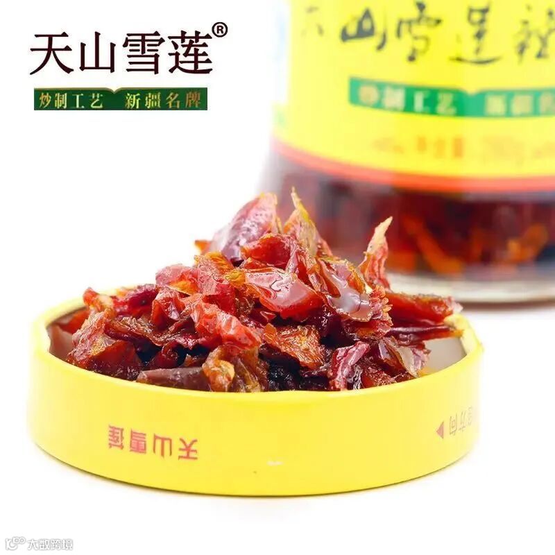 新疆天山雪莲辣椒丝,原材料选自辣椒之乡的安集海,香儿不辣,油而不腻,新疆人最爱吃的辣椒丝,馒头的伴侣,面条的情人,馕不离不弃的好朋友,新疆人嘴里不可缺少的美味..........