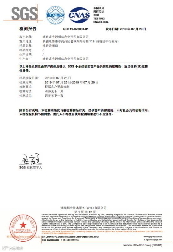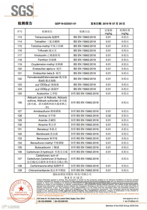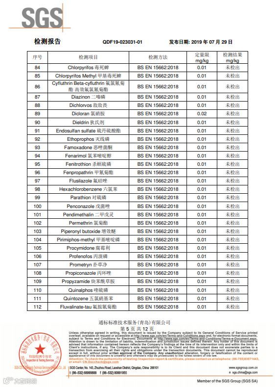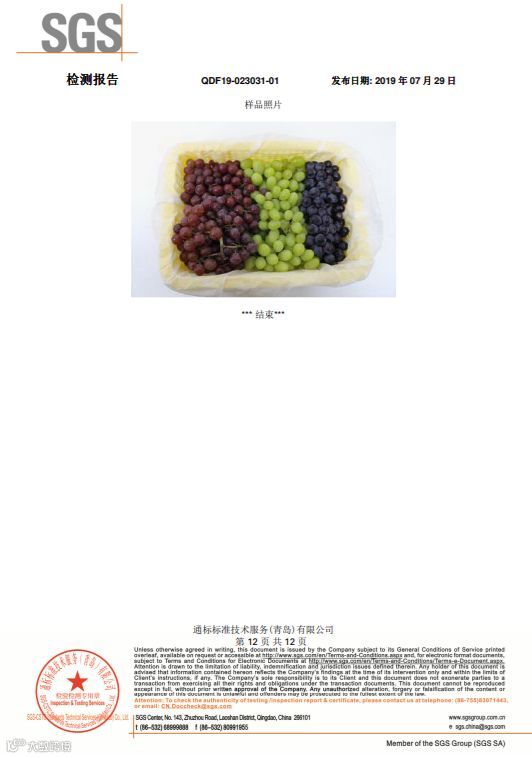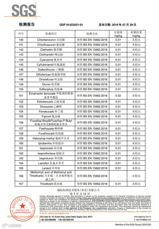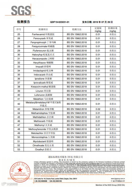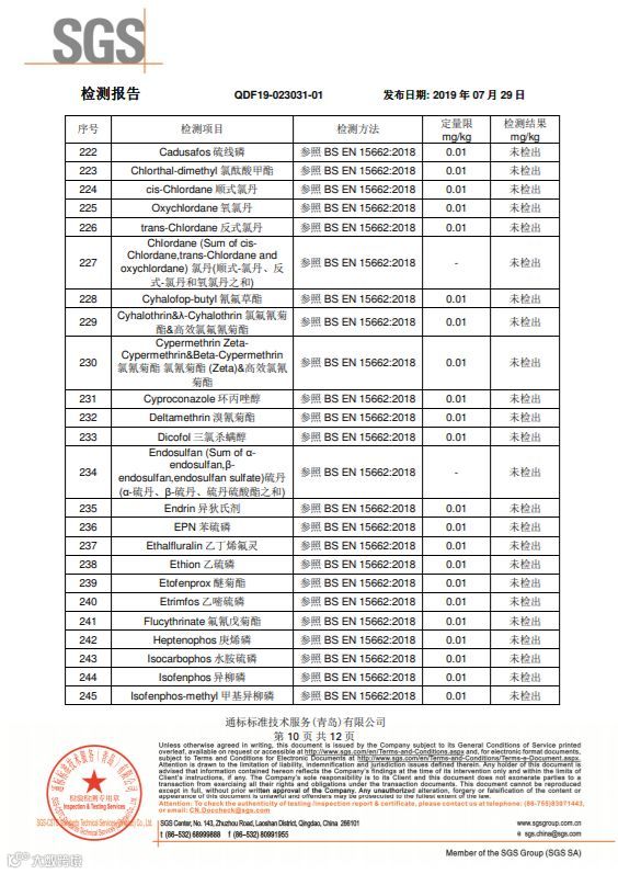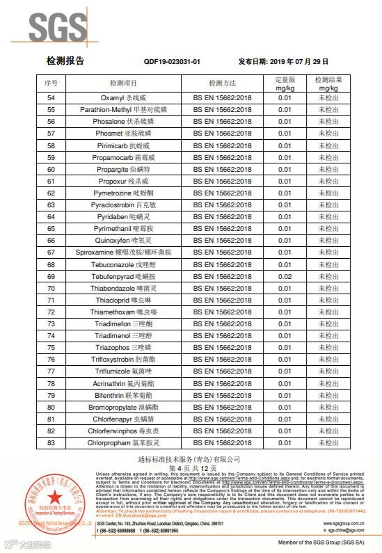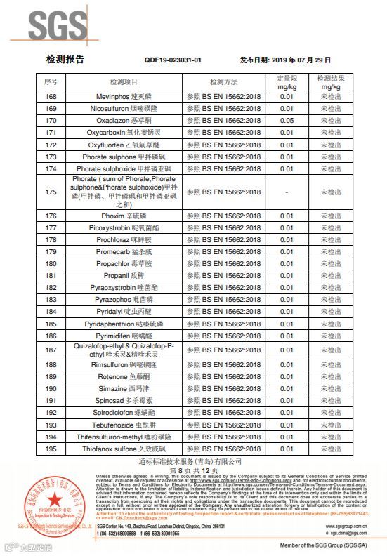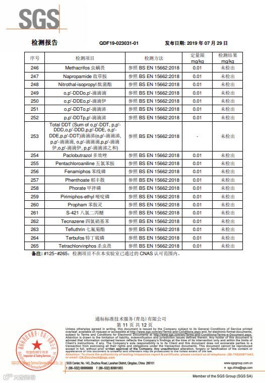 SGS国际互认的检测机构,随机批量采摘装箱,随机抽取样品寄送的检测结果,265项农药检测项目,结果全部是“未检出”。